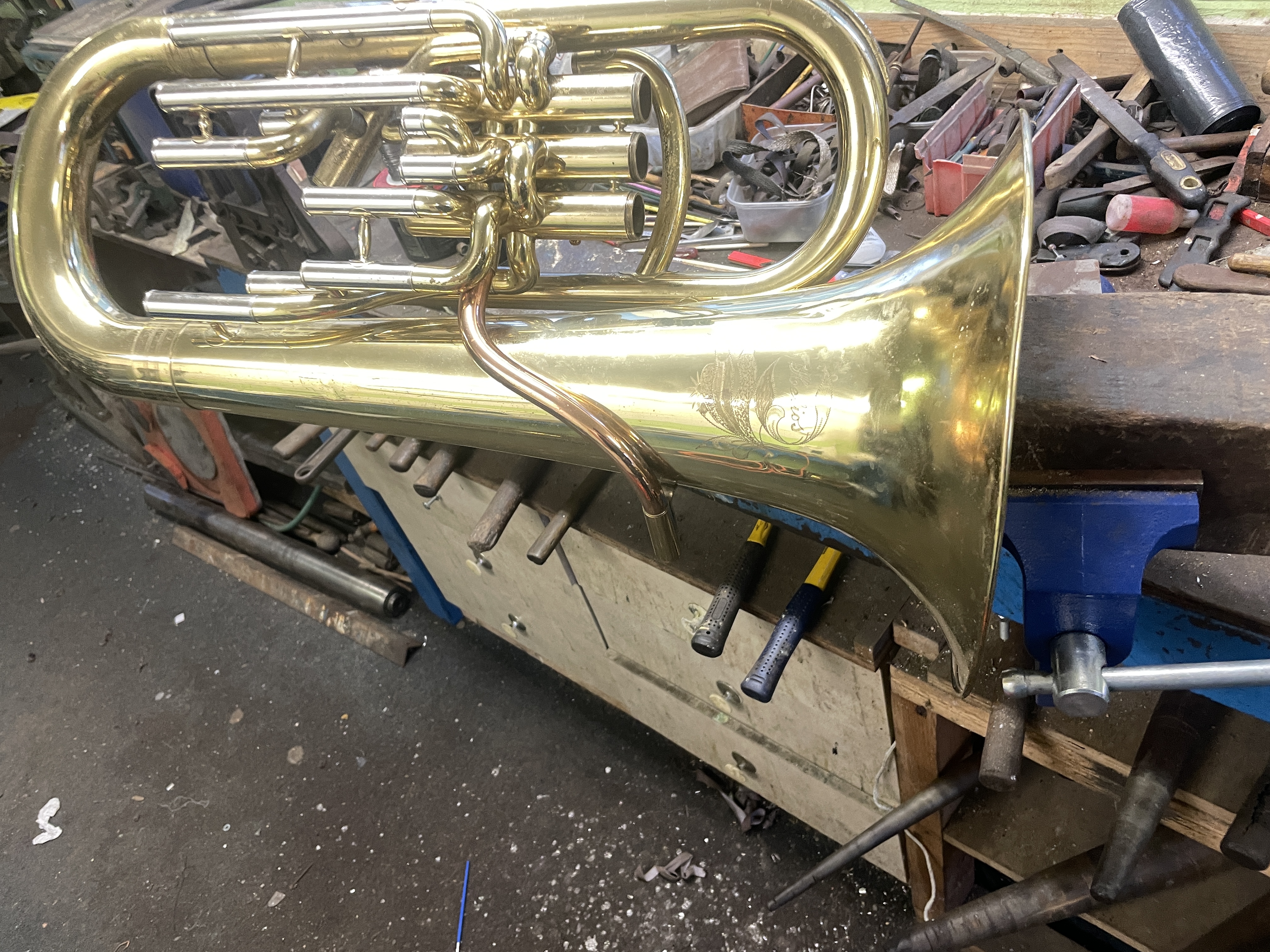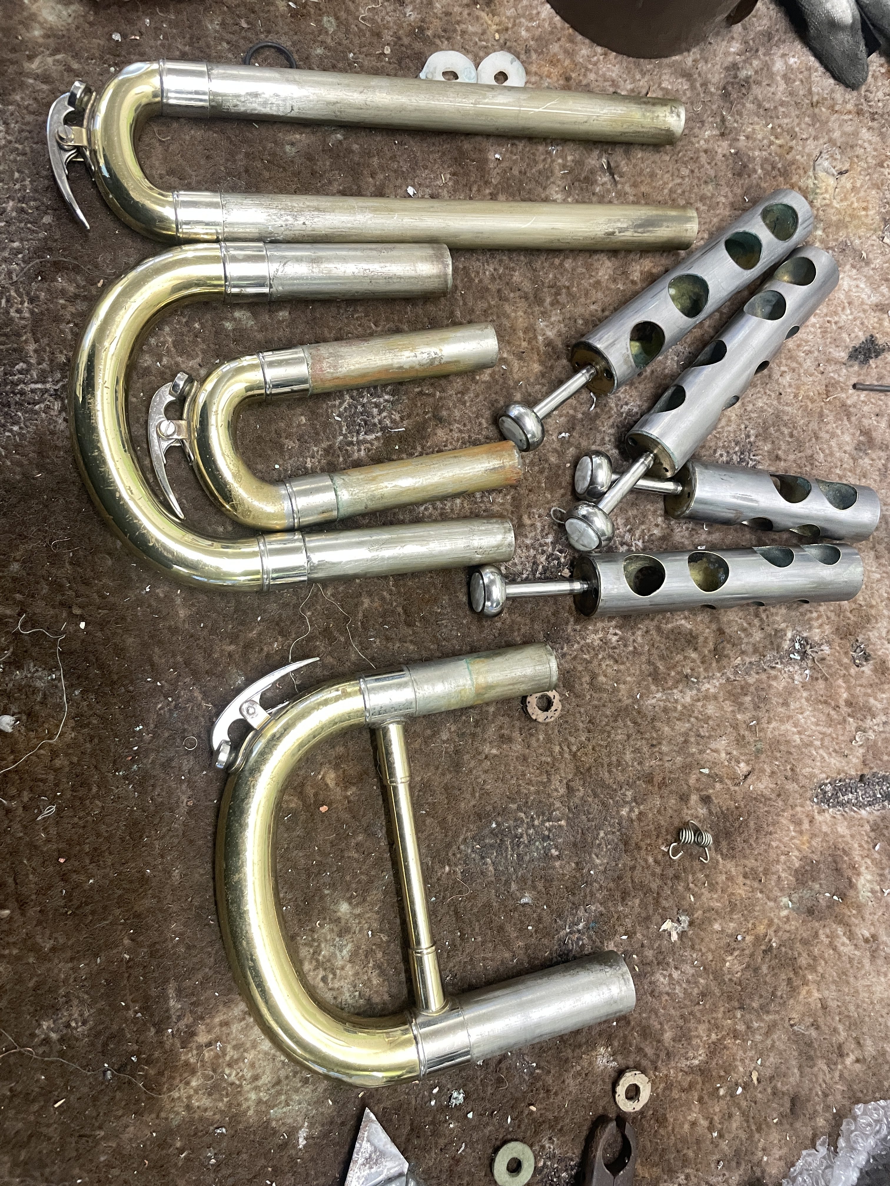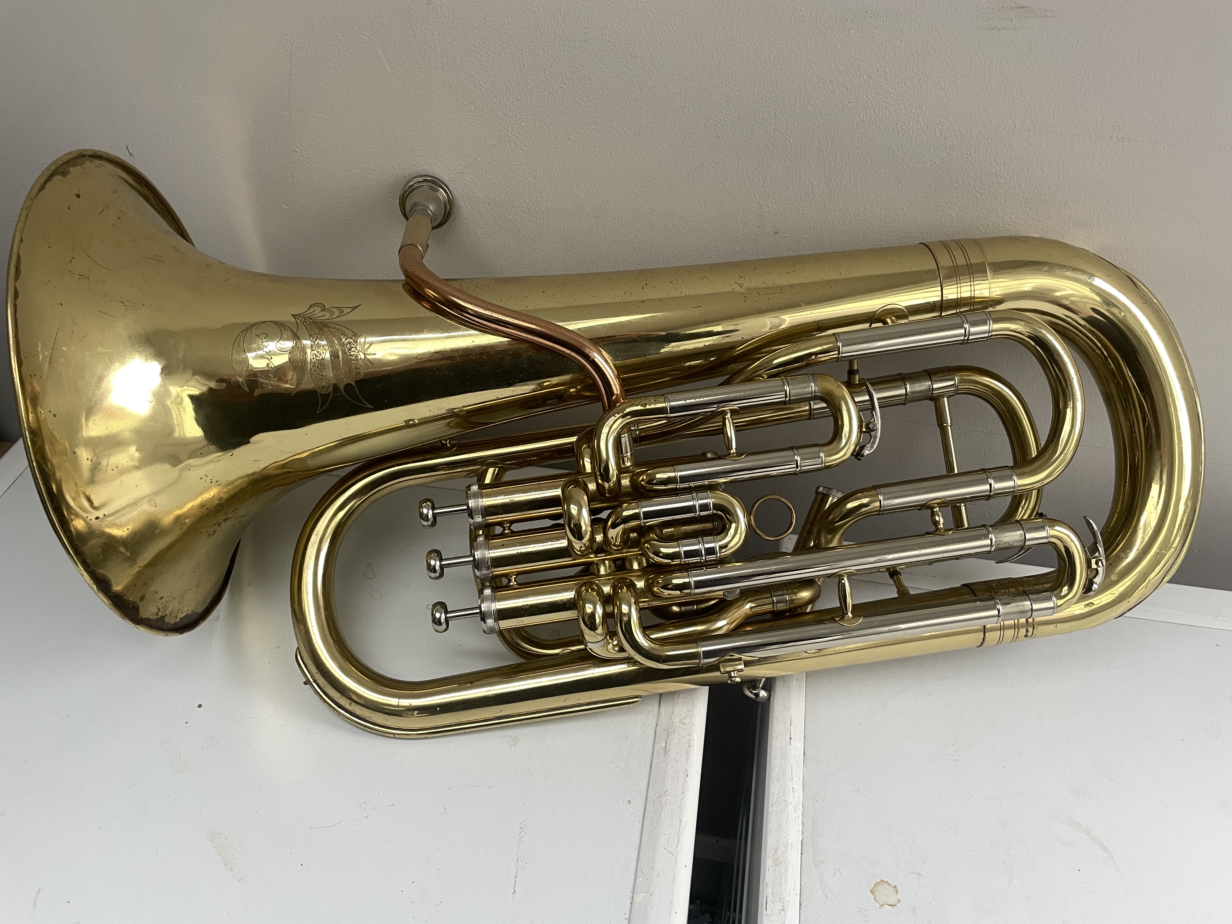 Just been serviced with slides removed ,new valve guides and pads fitted .The bell has had some dent work done and a little remains to be done, As can be seen the instrument is compensated and whilst not up in the Besson class it plays well enough to be accepted in the usual level of local brass band or youth training band.
